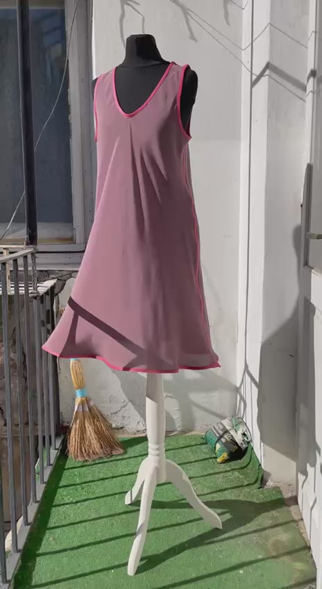 Soft V Neck Pale Purple Silk Dress with Red Dupioni Binding (Medium)