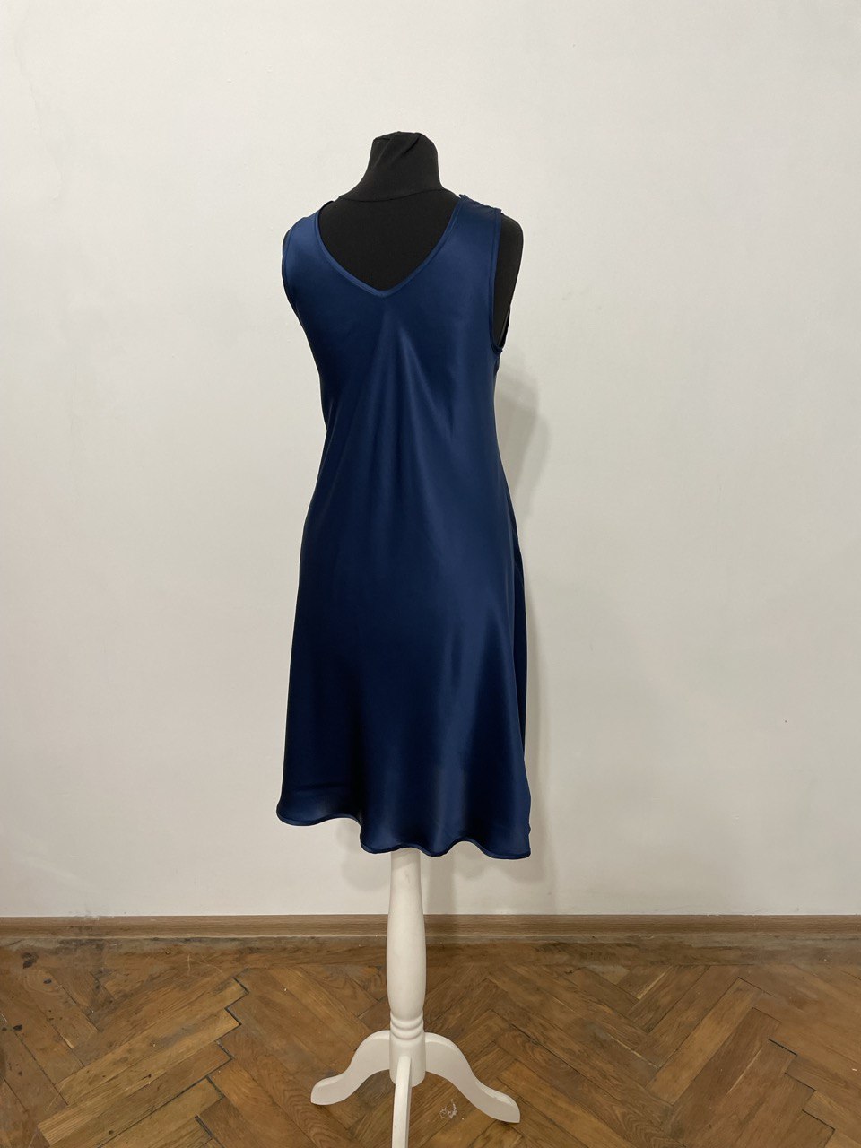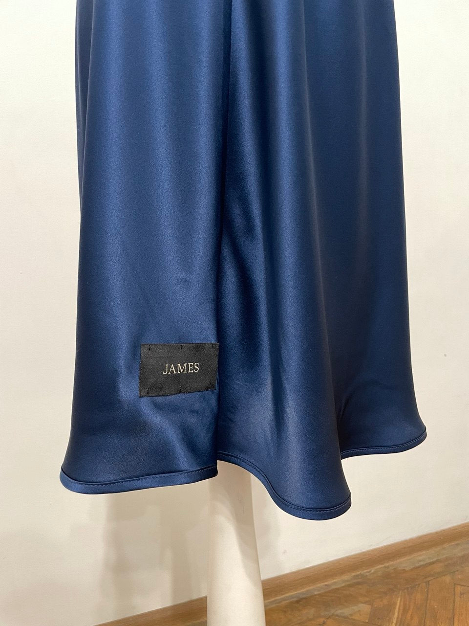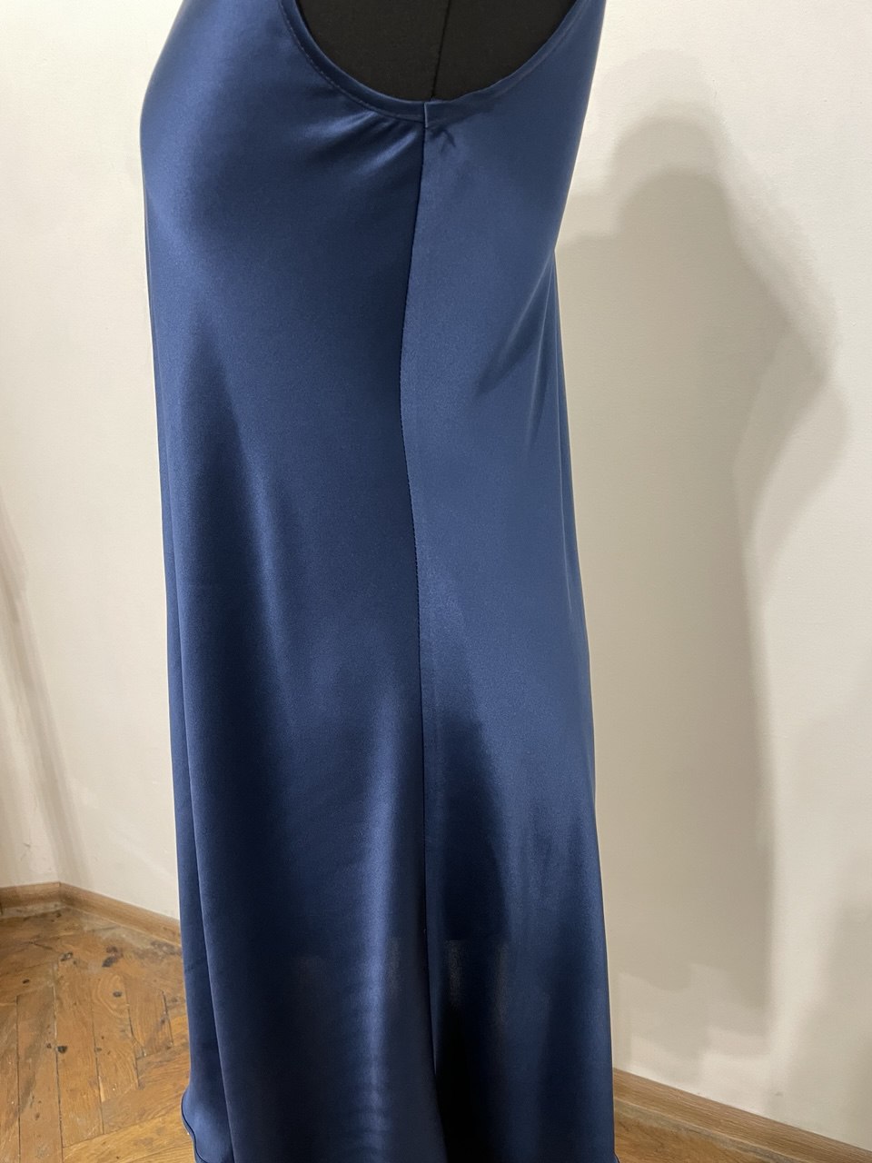 Midi Silk Satin Evening Dress in Deep Blue. Cut on the Bias, Sewn with French Seams, and Silk Piping around Neck,Arm, and Hemline.