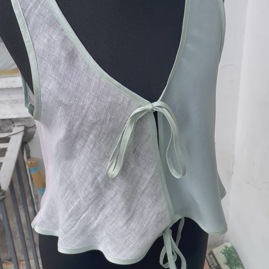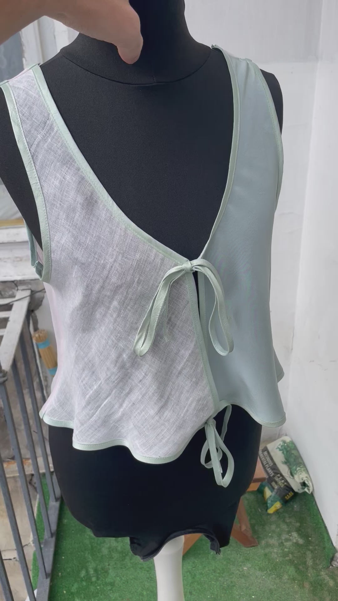Multi Fabric Vest. Handmade. Silk, Linen, Cotton, with Silk Rouleau Ties. Bias Cut. French Seamed.