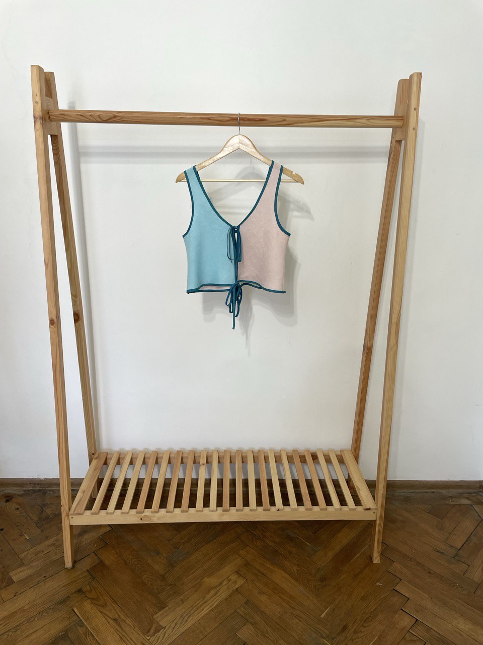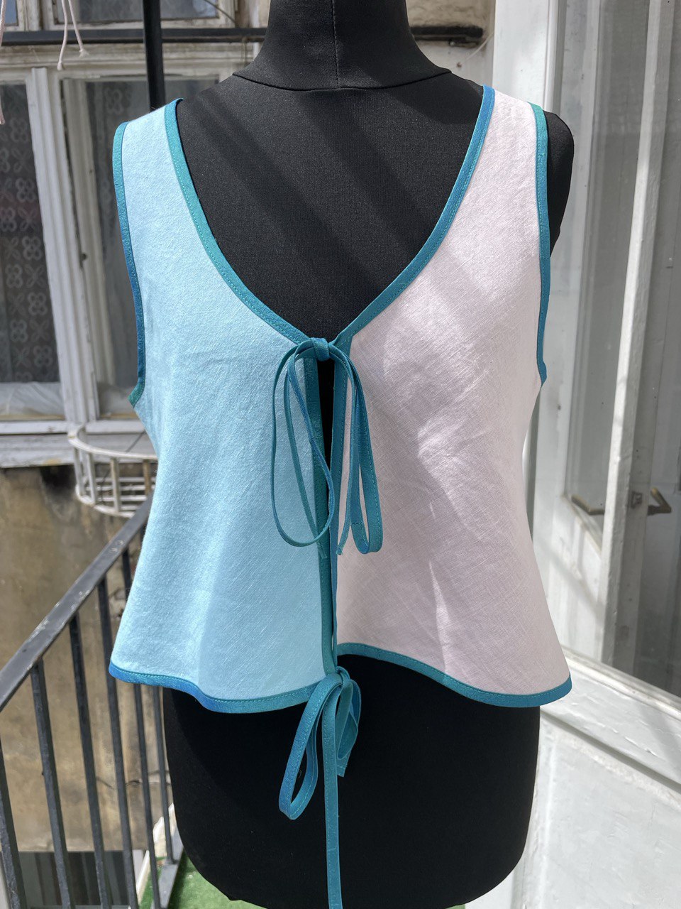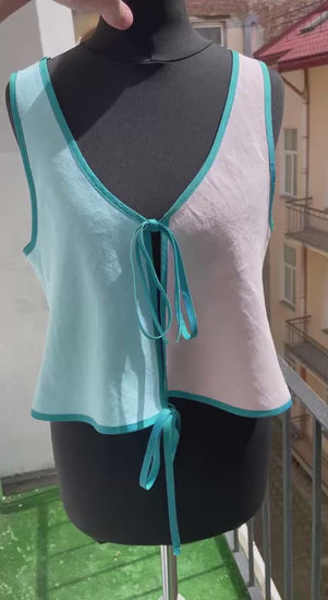 Four Panel Linen Vest, Cut on the Bias, Constructed with French Seams and Finished With a Fluorescent Blue Silk Piping Throughout the Piece.